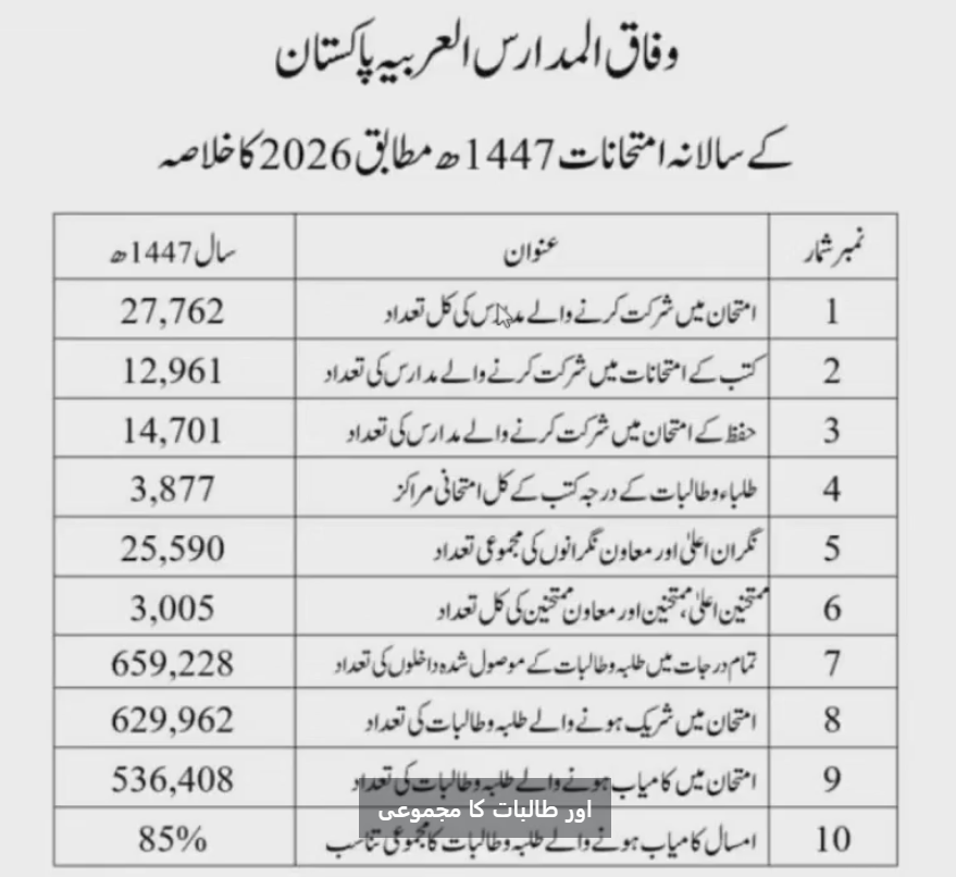 یہ تفصیلات وفاق المدارس العربیہ پاکستان کے سالانہ امتحانات 1447ھ بمطابق 2026ء کے نتائج کے اعلان کے حوالے سے جاری کی گئی ہیں۔